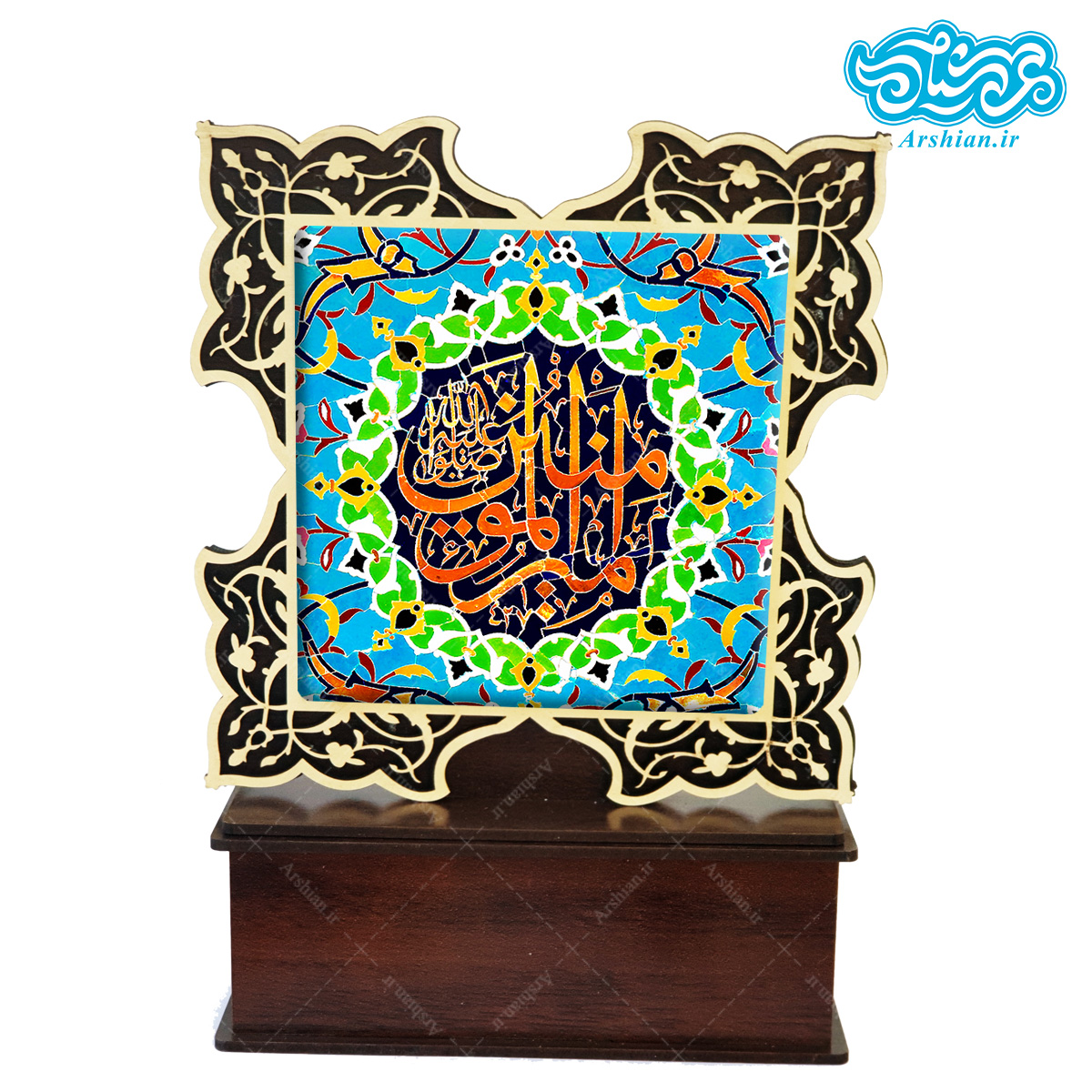 این تندیس زیبا، یک اثر هنری با کاشی 10 سانتیمتری است که با ذکر امیرالمومنین آراسته شده است. قاب چوبی مشبک با طراحی ظریف، جلوهای معنوی و دلنشین به این اثر بخشیده است. این تندیس به همراه پایه چوبی عرضه میشود و برای تزئین منزل، محل کار یا هدیه دادن به دوستداران اهل بیت (ع) انتخابی ارزشمند است. با قرار دادن این اثر در فضای خود، یاد و نام مولای متقیان را گرامی بدارید و از حس معنوی آن بهرهمند شوید.