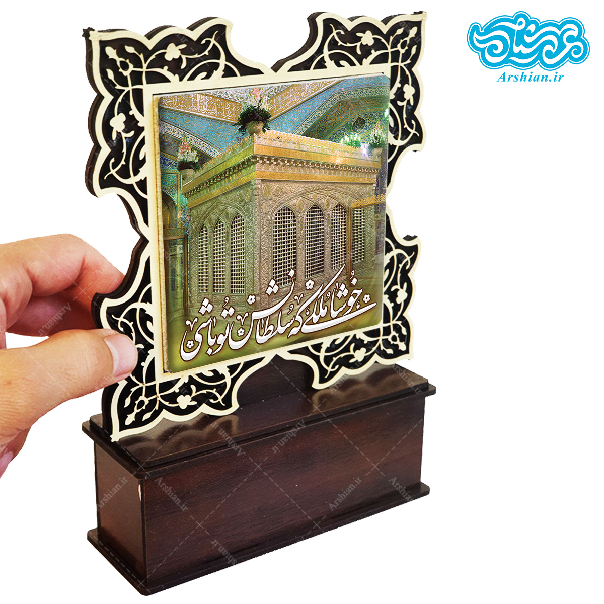 این تندیس زیبا، شامل یک کاشی مربعی به ابعاد 10 در 10 سانتیمتر با تصویری از ضریح مطهر امام هشتم امام رضا (ع) و عبارت دلنشین “خوشا ملکی که سلطانش تو باشی” میباشد که با خطی زیبا در کنار تصویر نقش بسته است.