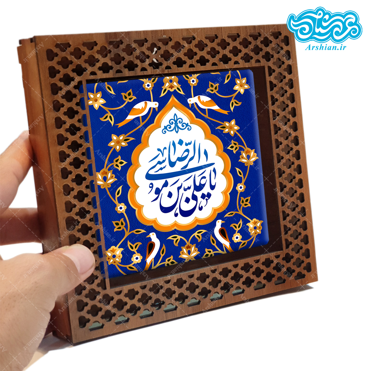 این قاب کاشی زیبا با طرح “یا علی بن موسی الرضا” یک اثر هنری مذهبی است که با ظرافت و دقت فراوان طراحی و ساخته شده است. قاب از جنس چوب با طرح مشبک ظریف جلوه ای خاص و معنوی به این محصول بخشیده است.
