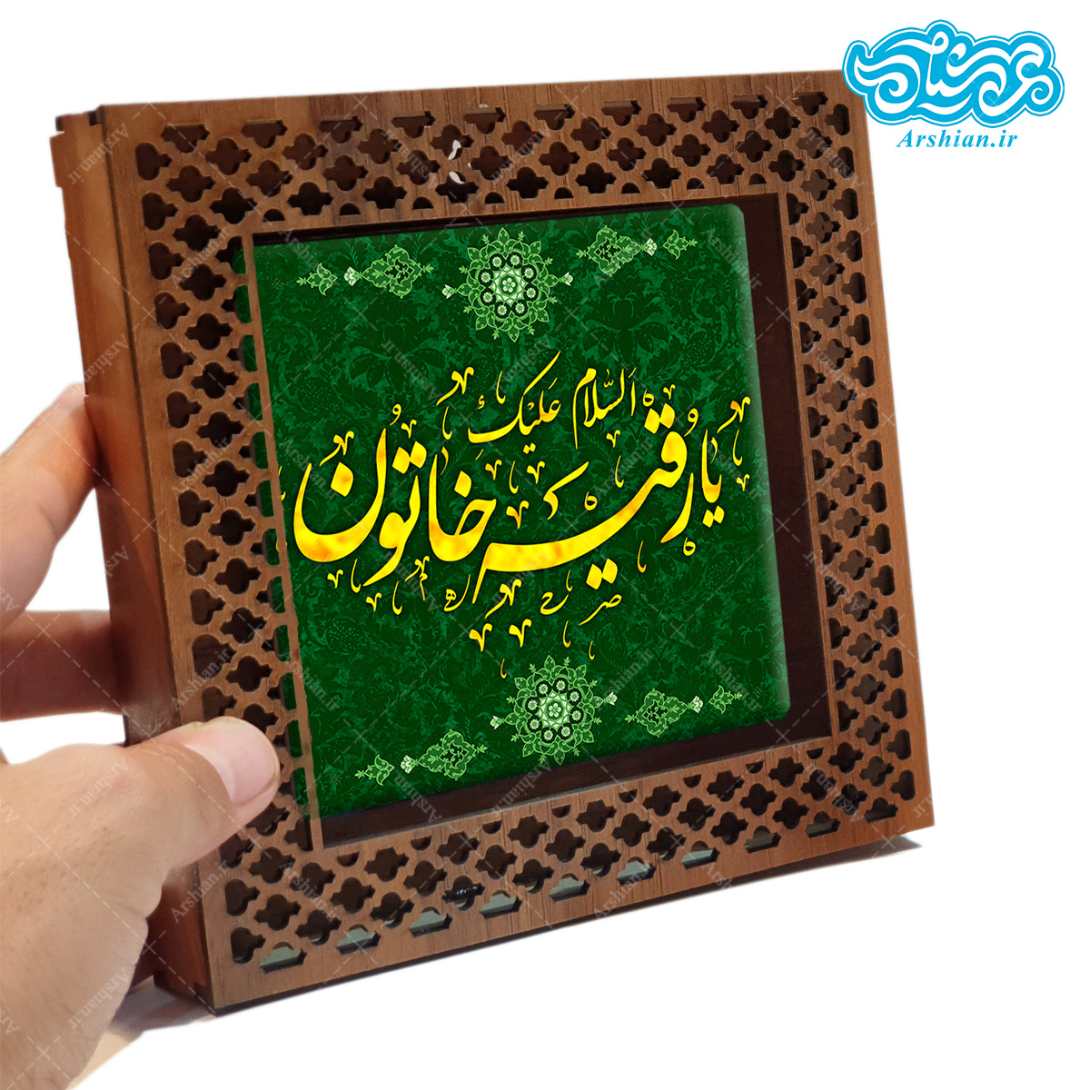 این قاب کاشی زیبا با طرح “یارقیه خاتون” یک اثر هنری مذهبی است که با ظرافت و دقت فراوان طراحی و ساخته شده است. قاب از جنس چوب با طرح مشبک ظریف جلوه ای خاص و معنوی به این محصول بخشیده است.